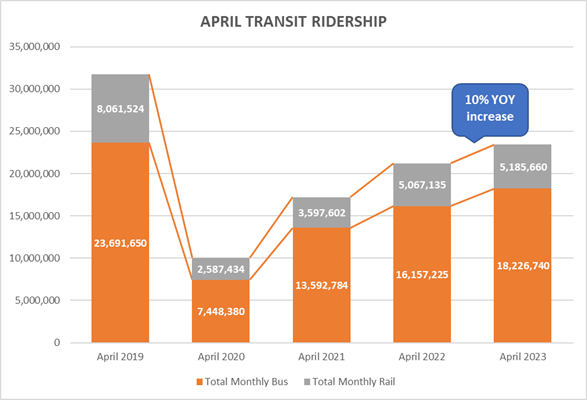 The Los Angeles County Metropolitan Transportation Authority (Metro) announced today that it delivered more than 23.4 million rides in April 2023, averaging about 880,000 weekday riders on the expansive bus, rail, and micro transit system. Total system ridership in April 2023 was 10 percent higher than in April 2022, reaching the highest ridership level recorded since the onset of the coronavirus pandemic in March 2020.