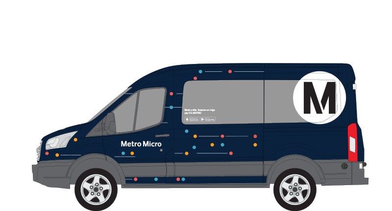 Metro Micro vehicles are a distinct dark blue with colorful graphics and official Metro symbols. The Metro Micro app and SMS notifications provide ride information, including a license plate number, vehicle types, and Driver’s name prior to pick up location arrivals.