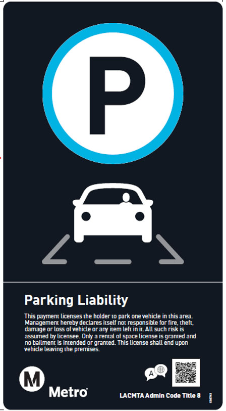 Metro no se responsable de daños, vandalismo o robo de propiedad personal que pueda resultar del uso de este estacionamiento. Por favor, aseguré su vehículo y mantenga posesiones de valor fuera de la vista del público. Usuarios que usan este estacionamiento lo hacen por su propia cuenta y riesgo en caso de fuego o actividad criminal.